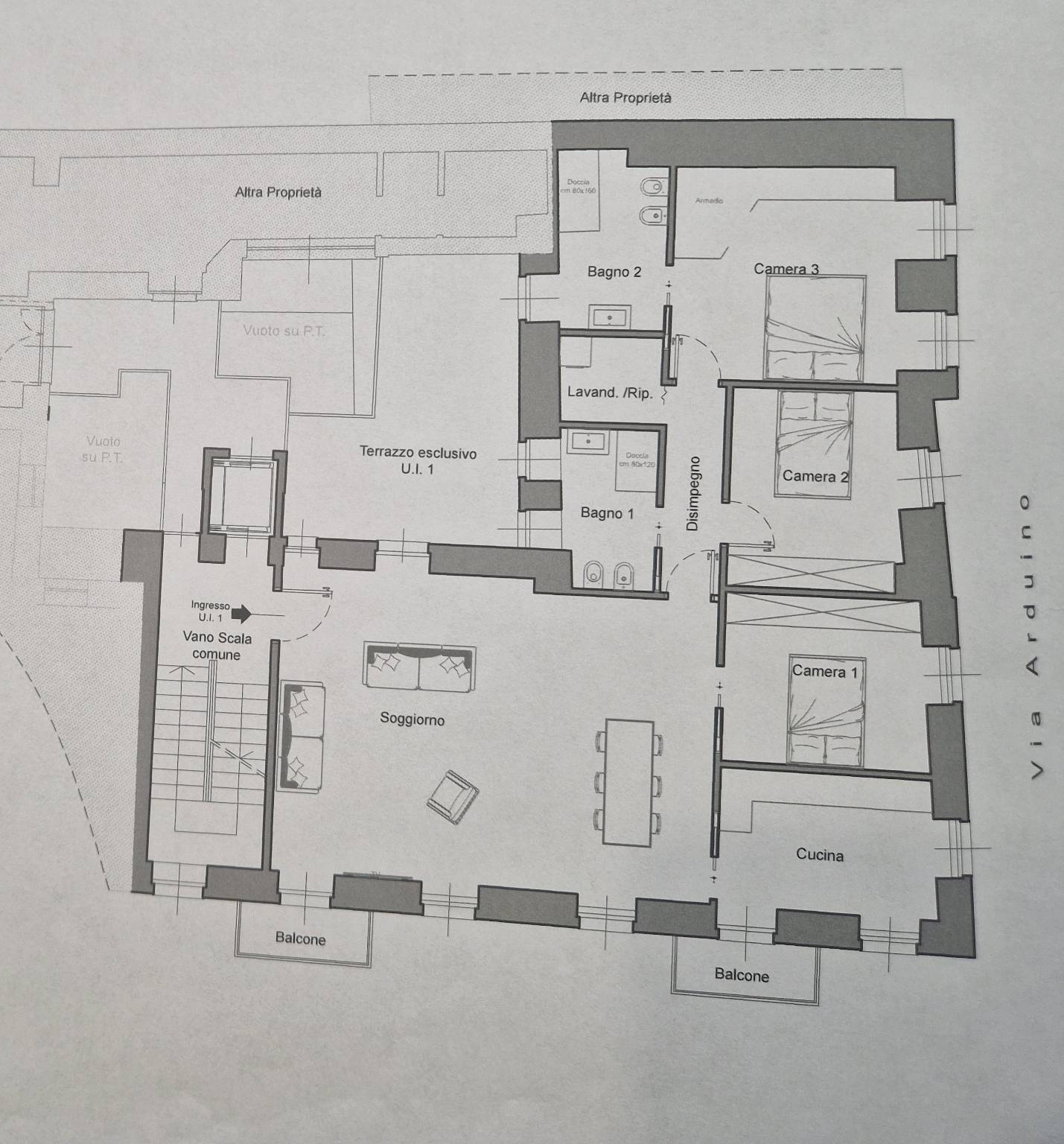 L'appartamento gode di splendido affaccio sulla Piazza di Città con 5 finestre e verosimilmente due balconi ( la proprietà é in attesa di autorizzazione comunale per detta variante ) nonchè di 4 finestre sulla via Arduino, affacci dai quali è naturale emozionarsi della vista panoramicissima e senza eguali.
